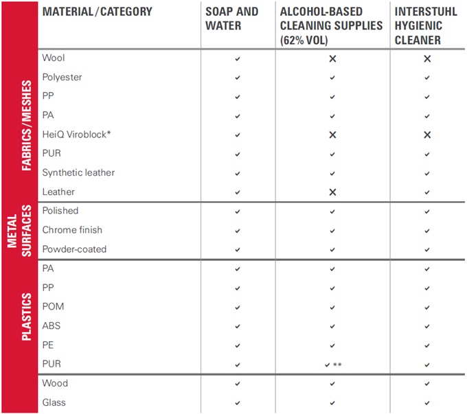 A távolságtartás és az érintkezések csökkentése a legfontosabb intézkedés a koronavírus és a COVID-19, valamint az általa okozott tüdőbetegség elleni küzdelemben. Mindehhez a fertőzés ellen védő, vagy a kórokozókat elpusztító termékek is jelentősen hozzájárulnak. Éppen ezért az Interstuhl bútorgyártóként azt a célt tűzte ki maga elé, hogy saját szakterületén is hatékony megoldásokat dolgozzon ki a járvány visszaszorítása érdekében. A tisztaság és a fertőtlenítés olyan témák, amelyeket ebben az időszakban előtérbe kell helyeznünk. Szakértelmünkkel támogatjuk ezeket az erőfeszítéseket és értékes tippeket szolgálunk az irodai székek és íróasztalok hatékony tisztításához, fertőtlenítéséhez. Annak ellenére, hogy ezek a felületek nem a fő koronavírus-vektorok, mégis érdemes ezek kezelésével tovább minimalizálni az átvitel kockázatát. Irodai székek esetében különösen fontos, hogy az érintkezési felületeket, például a kartámaszokat, az üléseket és az állító karokat tisztán és vírusmentesen tartsák.